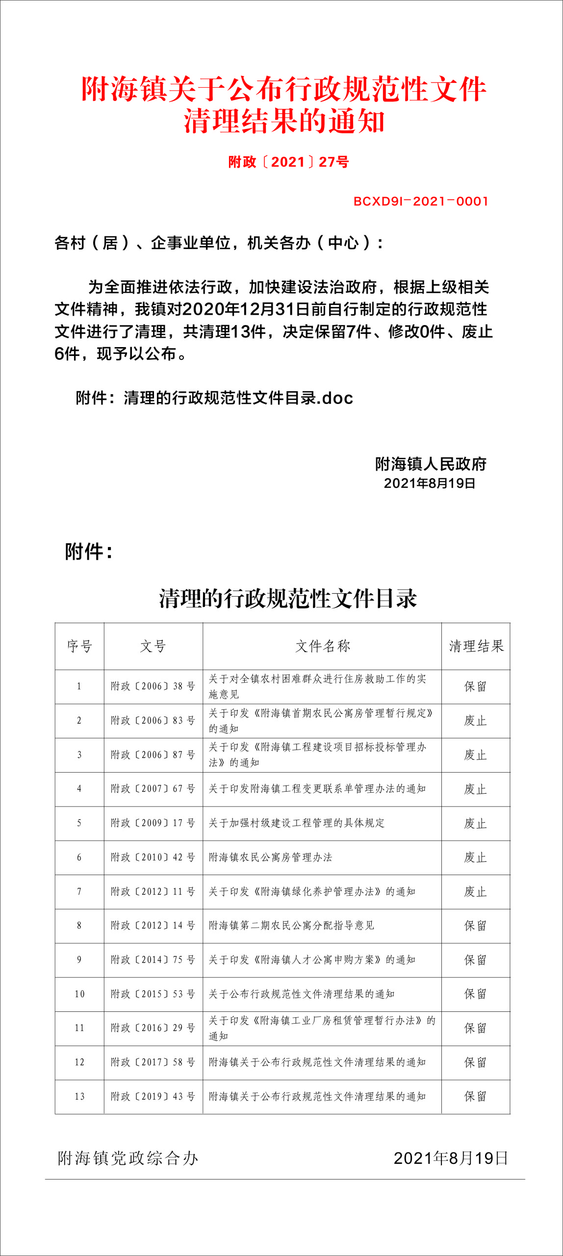 附海鎮(zhèn)關(guān)于公布行政規(guī)范性文件清理結(jié)果的通知圖解