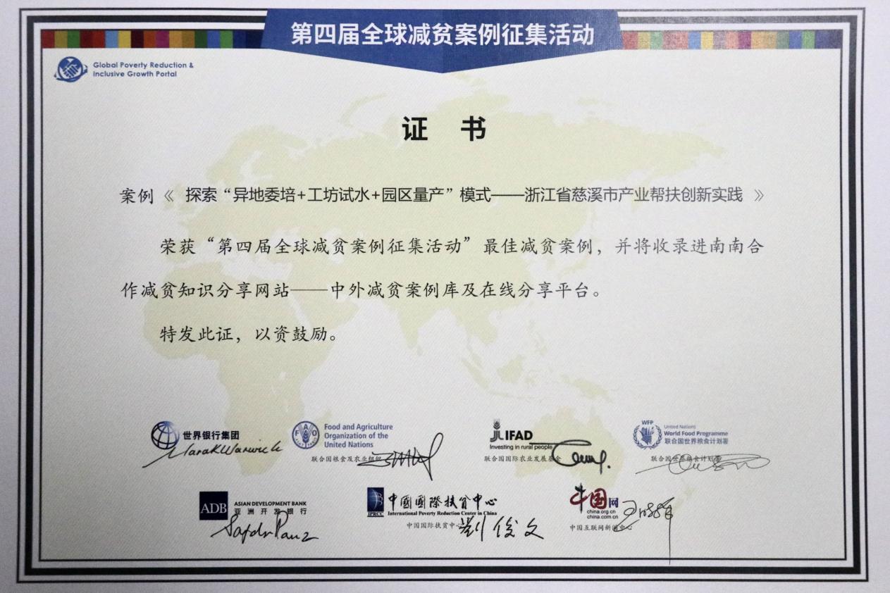 第四屆全球減貧慈溪市《探索“異地委培+工坊試水+園區(qū)量產(chǎn)”模式》獲獎證書