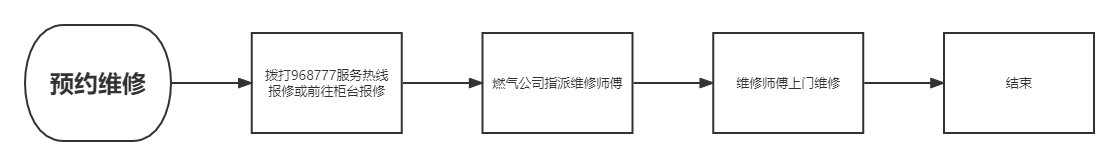 | 預(yù)約維修流程: | 燃氣客戶撥打96877服務(wù)熱線報修或前往柜臺報修,燃氣公司指派維修師傅1個工作日內(nèi)上門維修。 |