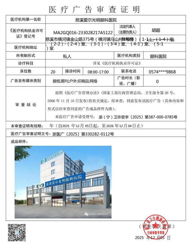 慈溪愛爾光明眼科醫院于2025年12月5日向我局提出醫療廣告審查申請。按照《醫療廣告管理辦法》等有關規定,經審查,同意發布該醫療廣告(具體內容和形式已經審查同意的廣告成品樣件為準)。