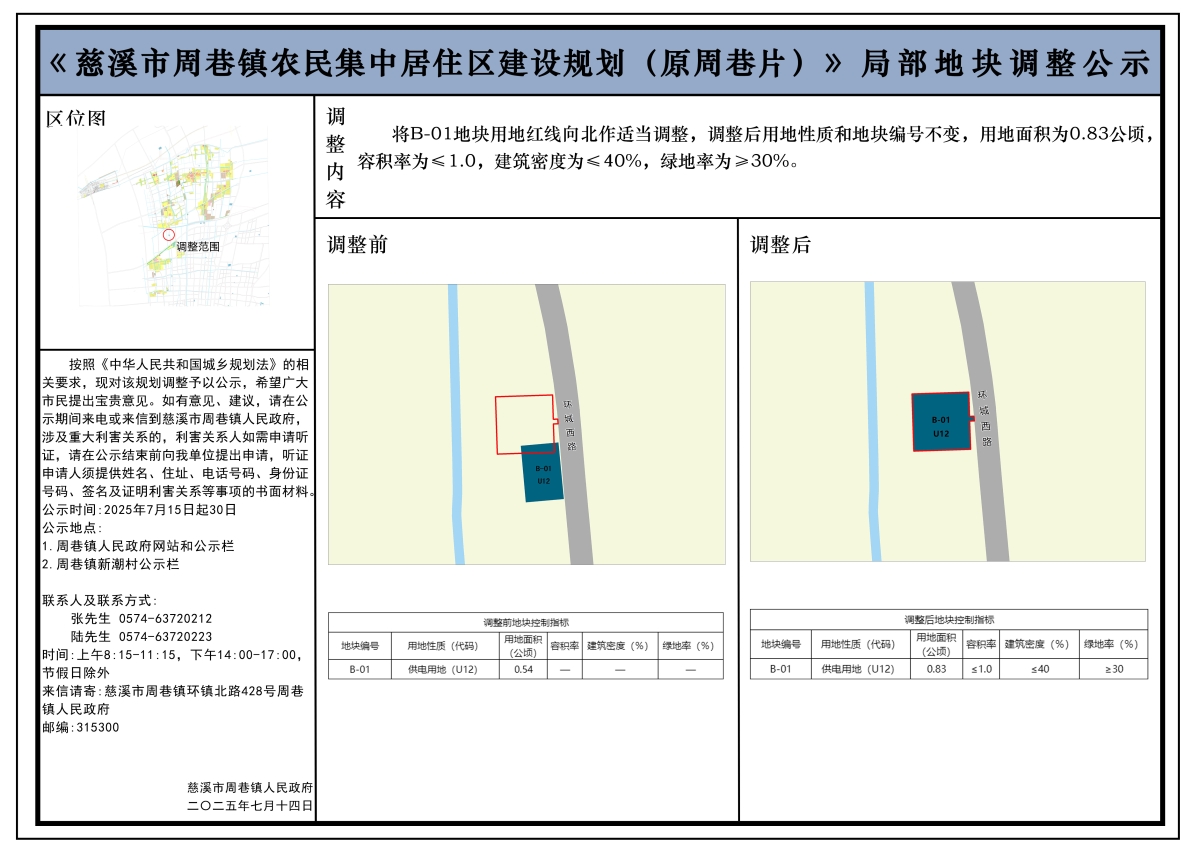 為保障市政基礎(chǔ)設(shè)施建設(shè),按照《中華人民共和國(guó)城鄉(xiāng)規(guī)劃法》的相關(guān)要求,現(xiàn)對(duì)《慈溪市周巷鎮(zhèn)農(nóng)民集中居住區(qū)建設(shè)規(guī)劃(原周巷片)》局部地塊調(diào)整方案予以公示,希望廣大市民提出寶貴意見。